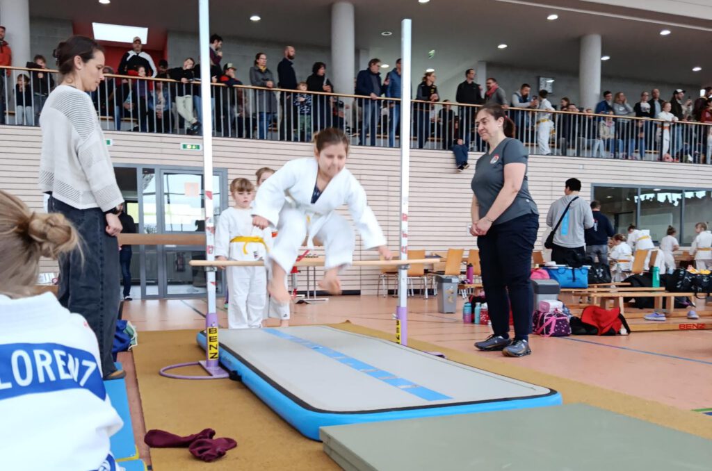 Das sport­li­che High­light bil­de­ten natür­lich die Kämp­fe. Trotz über 400 Star­te­rin­nen und Star­tern fand sich in der Roo­kies-Wer­tung kei­ne pas­sen­de Geg­ne­rin für Char­lot­te Weiß­haupt. So stell­te sie sich bei ihrem ers­ten Tur­nier außer­halb unse­res Dojos als ein­zi­ge Kämp­fe­rin mit dem 8. Kyu (weiß-gelb) der Her­aus­for­de­rung und trat in der Stan­dard­wer­tung der U10 weib­lich in der Gewichts­klas­se bis 45,2 kg an.